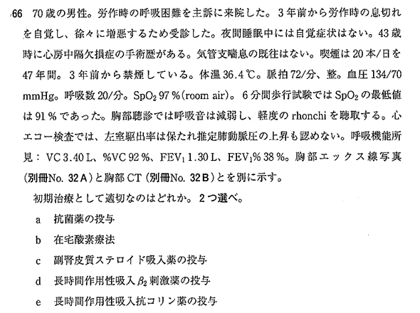 おそらくdeを意図した問題だが、FEV1% 50%未満であり最近の知見では初期治療に吸入ステロイドを加えても問題ない状態。喘息は無いとのことでACOSではないと言いたいのだろうが、臨床的にはcdeの3つが正解であり個人的に不適切と思います。