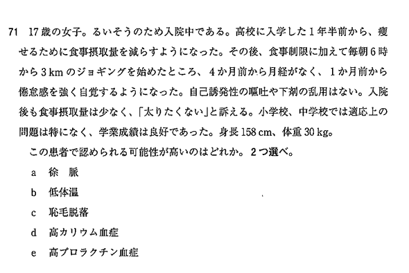 神経性食思不振症では貧血になるのになぜか徐脈に、低体温だけど攻撃性は強いと覚えていました。