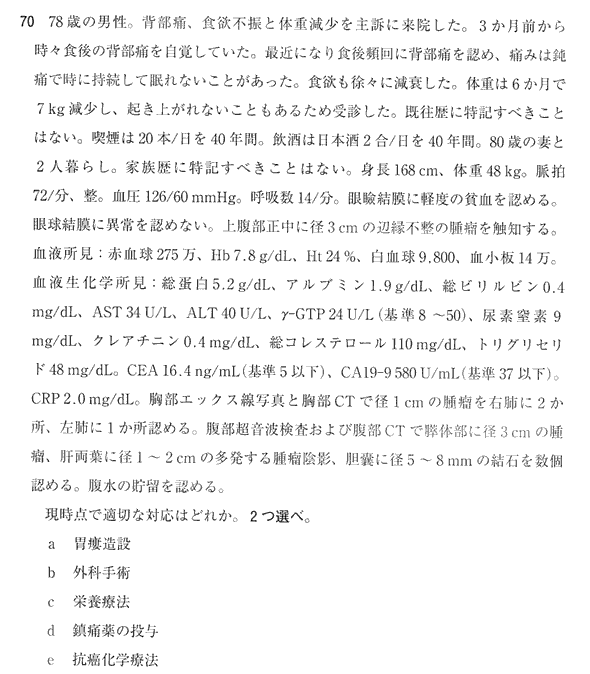 a,bは論外。現時点で膵原発癌の多発肺転移、肝転移が疑われる状況ではあるが、可能であればEUS-FNAで組織診断をつけてからケモ。病理がNECなど特殊な腫瘍であればそもそも治療自体が異なるし、また高齢であり、膵癌ケモするにしても良くICして希望があれば行う。