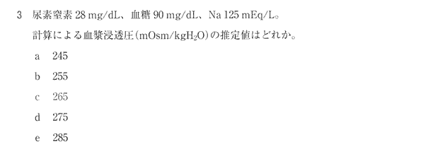 血漿浸透圧(mOsm/kg)=2[Na](mEq/L)+グルコース (mg/dL)/18+尿素窒素(mg/dL)/2.8
