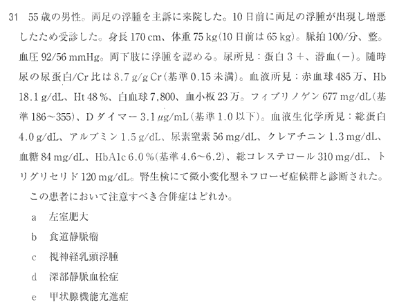 もともとこの患者さんはフィブリノゲンやDダイマーが高値であること、微小変化群の治療薬のステロイドが血栓症のリスクファクターであることからDが正解です。