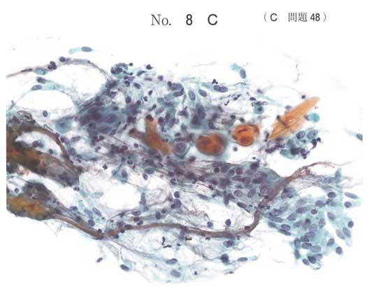 角化型の扁平上皮癌では、オレンジ色の細胞質を有する異型細胞が認められます。異型細胞も多形性に富んでおり、扁平上皮癌として矛盾しない細胞像です。難しいですね。