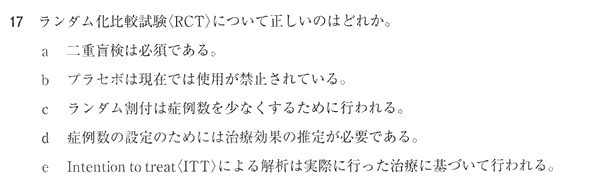 正解はd。症例数の設定に必要なのは、治療効果の差、標準偏差、第一種の過誤、第二種の過誤の4つである。