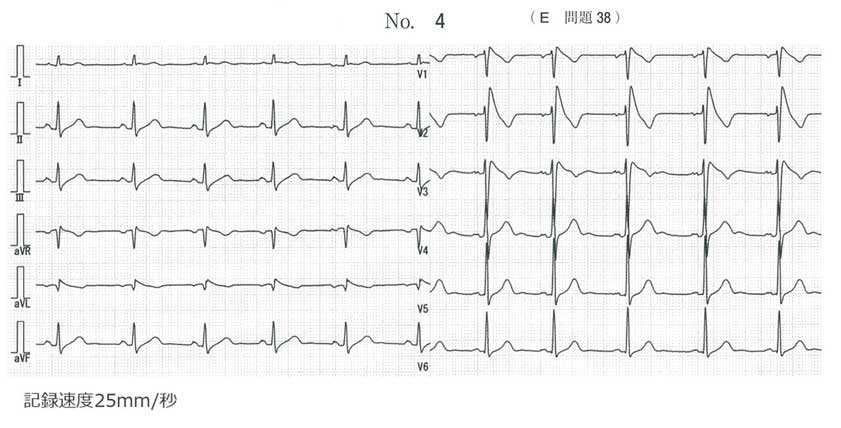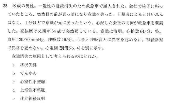 正解はc. 心電図はcoved型を呈する典型的なブルガダ症候群の心電図。父親が突然死している家族歴にも注目したい。ここはホルター心電図等して、VTやVFを検索するのが臨床。