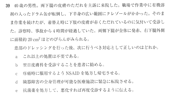 ぶっちゃけ現実的にはaかbでいいような気がするけど(洗い流す以上のことはやりようがないし)、国試だとほかの選択肢が怖すぎてdを選ぶかな・・
