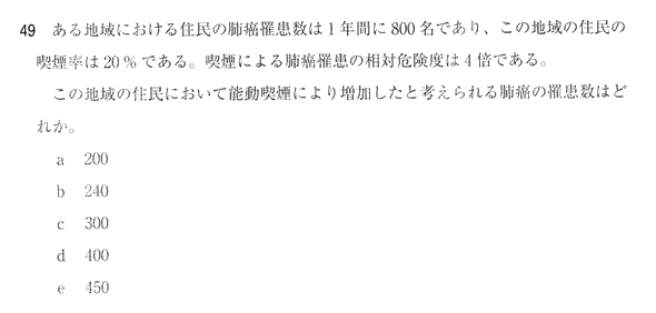 この地域の人口をAとすると、罹患率It=800/Aである。P=0.2なので、It=0.2×Ie+0.8×Ioという公式を立て、これにIe/Io=4、すなわちIe=4×Ioを代入すると、It=1.6×Ioとなる。すると、800/A=1.6×Ioなので、Io=500/Aである。したがって、この地域における人口寄与危険度は800/A-500/A=300/Aであり、cが正解となる。