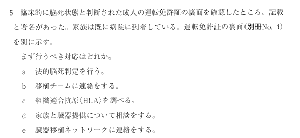 この5つの選択肢ではeでしょう。いきなり家族と臓器提供の相談はしないと思います。
