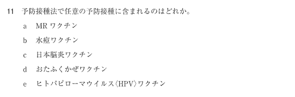 ムンプスは任意接種。なお、予防接種法には「任意の予防接種」や「任意」という文言は一切ない。任意接種は予防接種法と無関係に実施されるのだから、設問の「予防接種法で」は余計である。
