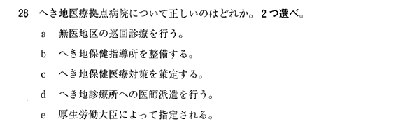 aとdが正解。b、c、eは都道府県知事の業務。なお、へき地保健指導所はへき地医療計画に基づいて整備され、保健師を配置し、保健に恵まれない地域住民への保健指導強化を目的とする組織