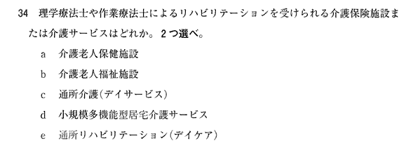 aとe。ちなみに、機能訓練型デイサービスというものもあり、理学療法士または作業療法士を少人数配置しているが、実際には彼らの指示のもとに、介護職や看護職がリハビリに当たっている。eとはレベルが違うので、cを選ぶべきではない。