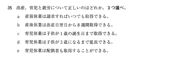 〇c 母親の場合、原則は産後休業が終了したのち、児が1歳の誕生日を迎える日の前日までであるが、保育所に入れないなどの事情があれば、2歳の誕生日まで延長できる。ちなみに、福利厚生の一環として、3歳までの育児休業を認めている企業もあるが、これは法律上の要請ではない。