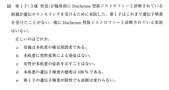 e 本問題は「臨床的」に、なので、この症例が実際に筋生検などをしたら、異なるタイプの筋ジストロフィーと確定診断される場合もありますが、臨床経過としての診断は覆ることはありません
