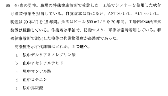 シンナー thinnerは塗料を薄めて粘土を下げる薬剤で、その成分はトルエン、キシレン、スチレンなどの芳香族炭化水素、エステル、ケトン類などである。したがって、トルエンの代謝産物である馬尿酸(e)とスチレンの代謝産物であるマンデル酸(c)が検出される。ちなみに、昭和の時代に非行少年の「シンナー遊び」が流行したが、彼らは不純物を含むシンナーではなく、100%トルエンを使用していた。