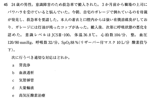 灯油やガソリンを飲むと、揮発して気管に入り、出血性肺炎を引き起こす。吐かせると、吐物が気管に入るので禁忌。可及的速やかに気管挿管を行う。なお、本人または遺族は後にパワハラ上司に損害賠償請求訴訟を起こすだろう。上司は会社と連帯して数千万円の賠償金の支払を命じられることになる。パワハラは場合によっては全財産を失う行為であることを肝に銘じておこう。