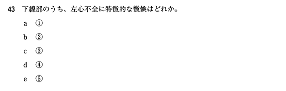左心不全により肺うっ血を呈する。起坐呼吸は肺水腫による症状であり左心不全の徴候である。