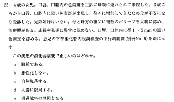 「この疾患で」であり、「この症例で」ではないのが大事かなと。つまり、PJSで一般的に腸重積などの通過障害を起こしうるかどうかということが聞かれているのであり、この大きさのポリープで閉塞するかどうかは聞かれていないのだと思います。