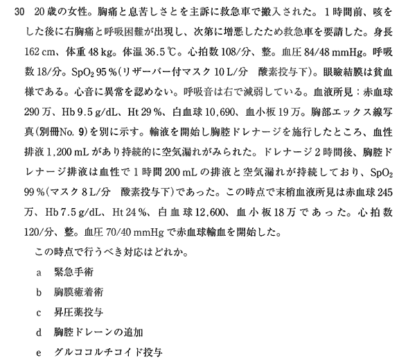 血気鏡→ドレナージは安直ですね。出血コントロール不良が強調されていて、問題文最後にバイタルまで書いてくれていることも作問委員からのヒントに思えます。
