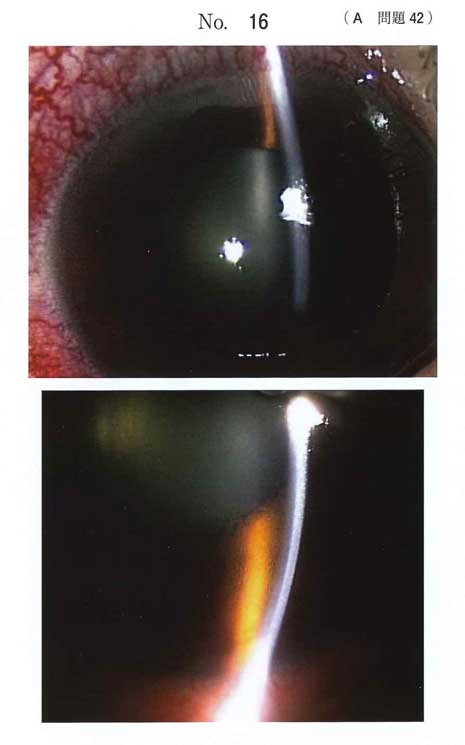 画像診断 別冊No. 16の細隙灯顕微鏡写真(上図)では、毛様充血が著明に認められる。前房は狭く、瞳孔径は約5mmで中等度の散大である。虹彩に当たっている細隙光はやや曲線を示しており、これは瞳孔ブロックが生じた結果、虹彩が膨隆していることを意味する。下図では虹彩からの徹照光によって角膜の混濁(角膜上皮浮腫)が観察されている。