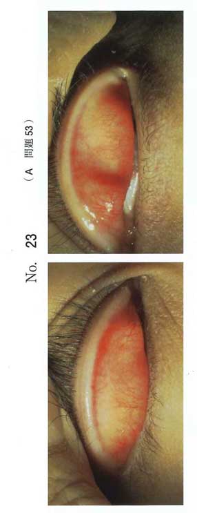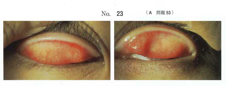 画像診断 別冊No. 23の両上眼瞼結膜の写真では、結膜充血が観察されている。