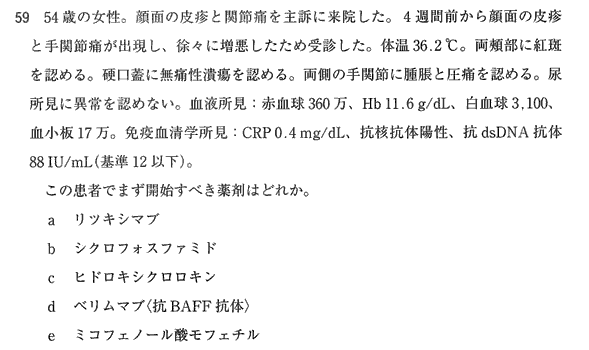 確か115回だったかなあ?SLEの臨床問題の文章中にヒドロキシクロロキンが出ていました。