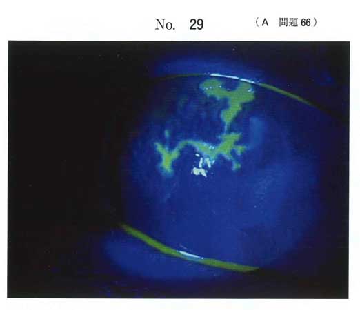 画像診断 別冊No. 29の左眼フルオレセイン染色後の細隙灯顕微鏡写真では、末端の膨大部(terminal bulb)をともなった樹枝状角膜潰瘍が認められる。