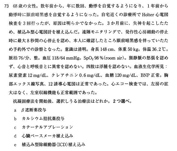 eは論外。ICDはVT/VFに備えるものであってAFには使いません。(植込み型心電計や遠隔モニタリング、EF低下例の一次予防ICDという近年の不整脈の実臨床に関わっていそうな先生の出題って感じで好き)