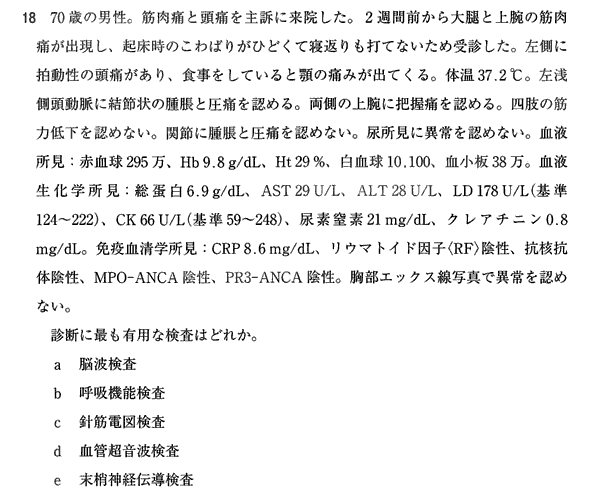 少し前の高安の除外問題から、GCAでFDG-PETや生検を選ばせる問題を予想していたのですが、単純にエコーというあっさりした問題でしたね。