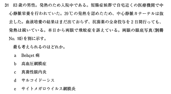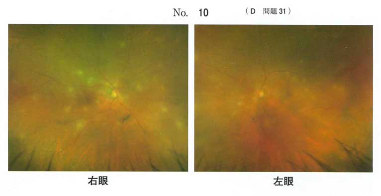 補足:両眼底とも、網膜動脈は狭細化しているので、あるなしで言えば高血圧網膜症は「ある」。しかし本問の出題意図は飛蚊症の原因疾患を問うことにあると考えられるので、bを正解選択肢とするのは妥当ではない。この問題は設問文に述べられた背景が正解を得る根拠となる。しかし眼底写真から真菌性眼内炎を診断するというのは、正直、受験生には酷であろう。