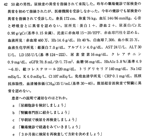 正解:b.「腎臓専門医に紹介しましょう」