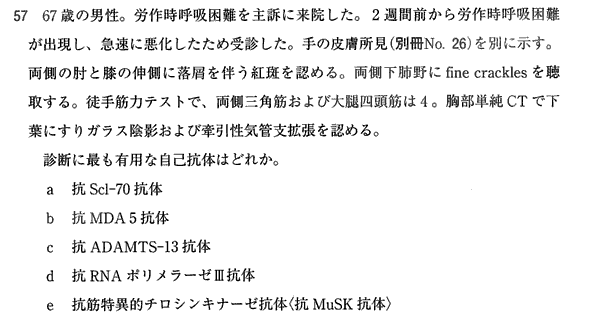 ゴットロンとかはよくわかりませんが、急速に進行する呼吸困難、fine cracklesとCTから間質性肺炎になりそうなやつを選んだらいいんですかね。