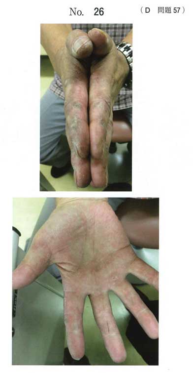 上の写真は機械工の手,下は逆ゴットロン徴候.MDA5陽性皮膚筋炎や抗ARS抗体症候群でみられる.抗scl-70抗体は強皮症の抗体なので,皮膚硬化が皮膚所見となる.よってb