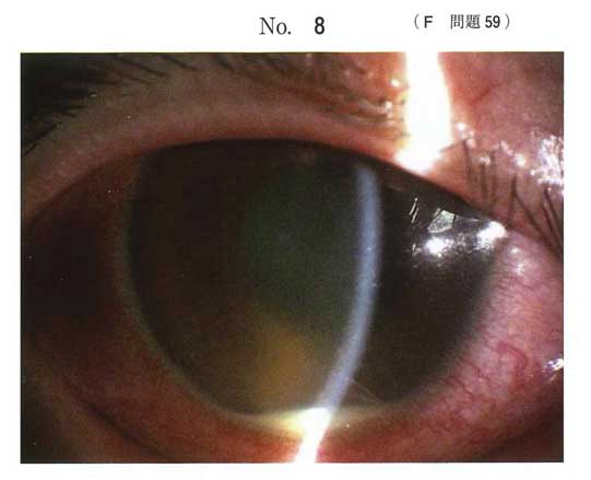 画像診断 別冊No. 8の左眼の細隙灯顕微鏡写真では、著明な毛様充血と前房蓄膿が認められる。