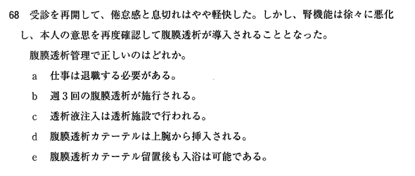 他の選択肢はあからさまなので難しくはないものの、腹膜透析患者を実際に見ないとわからないネタなのでなかなか細かいところ聞いてきてて驚きました。入浴をいつからどう許可するかは明確な基準がなく、防水してシャワーからって施設と最初からオープンにしてシャワー浴びさせる施設があり実は全く基準がないです。ただ清潔を保つのは大事なので定期的な入浴は明確に推奨されています。